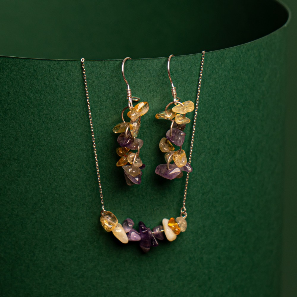 استفاده از سنگهای آمیتیست و سیترین در این ست، زیبایی و انرژی مثبت خاصی را به ارمغان میآورد. آمیتیست با خواص آرامشبخش خود و سیترین با انرژی مثبت و خوشبختیاش، ترکیبی عالی برای افزایش حس خوب در زندگی است.