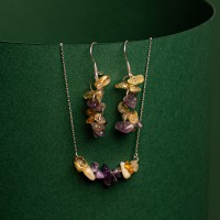 ست سنگ آمیتیست و سیترین یک انتخاب زیبا و لوکس برای کسانی است که به دنبال جواهراتی با انرژی مثبت و زیبایی خاص هستند. این ست شامل آویزهایی با طراحی شیک و زنجیری از نقره 925 است که به جذابیت آن افزوده است.