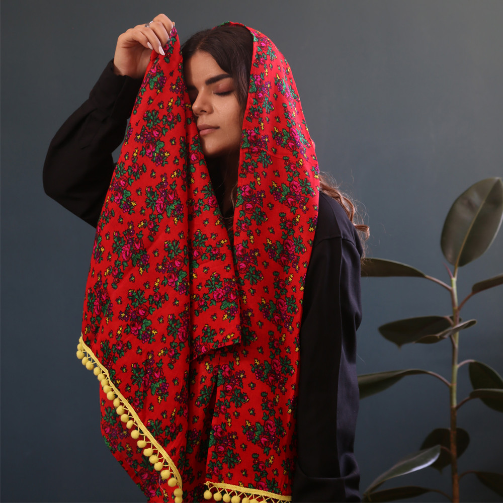 اگر بهدنبال یک شال متفاوت و خاص هستید که با اولین نگاه توجهها را به خود جلب کند، شال گلدار قرمز با گلهای قرمز و یراق منگوله زرد بهترین انتخاب شماست.