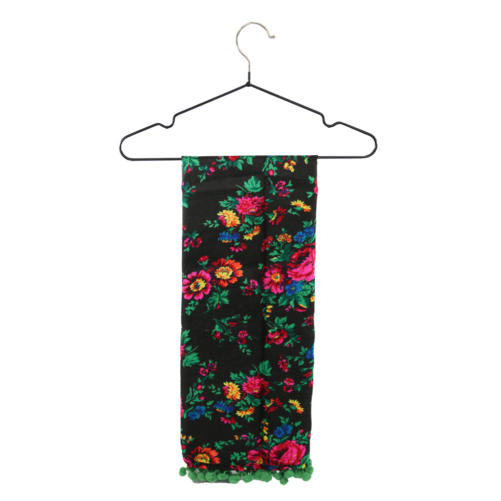نتیجهاش میشود شالی که فراتر از یک اکسسوری است—شال مشکی با گلهای ریز و درشت در رنگهای صورتی، قرمز و زرد، ترکیبی از رمزآلودی و سرزندگی در یک قاب پارچهای.