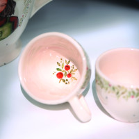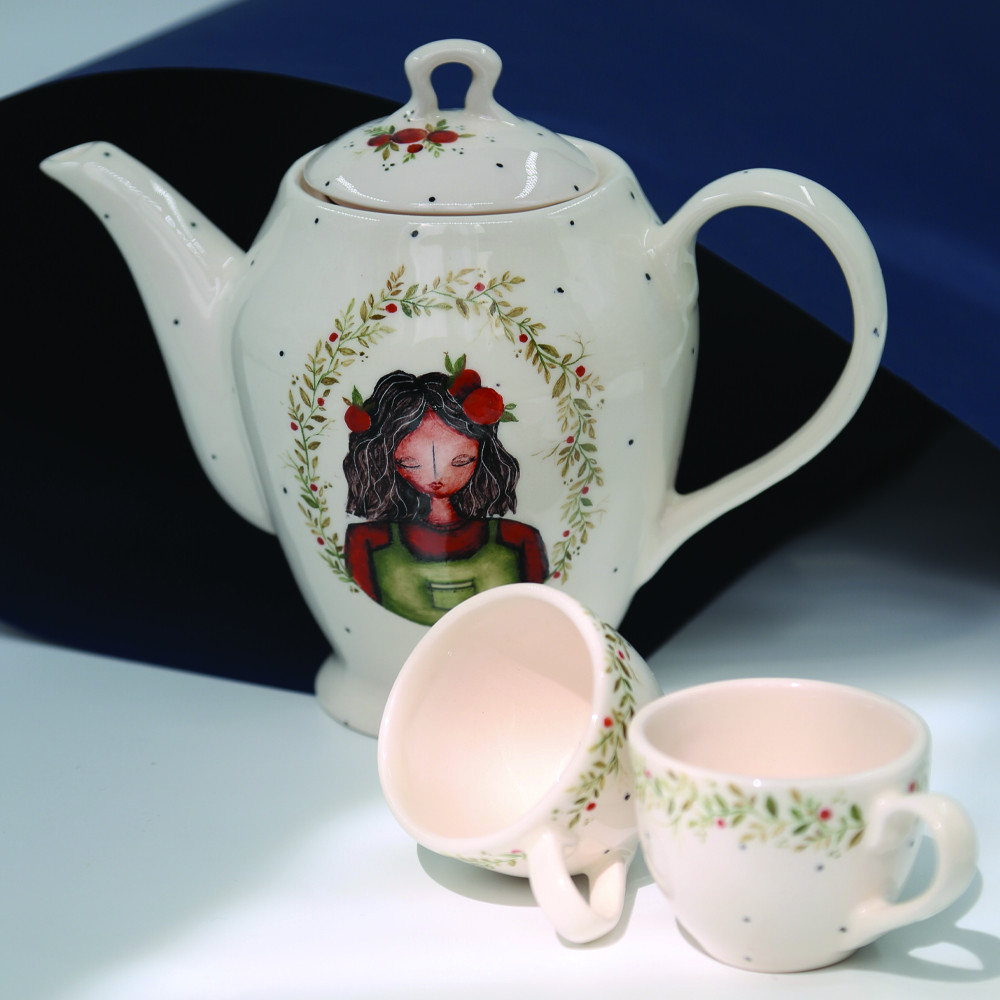 ترکیبی زیبا از هنر و کاربری است. بدنه سفید قوری با نقاشی دستی یک دختر و حلقهای از گلها و برگهای ظریف تزئین شده که جلوهای شاعرانه و خاص به آن میبخشد. روی فنجانها نیز طرحی هماهنگ از گل و برگ کار شده که مجموعه را کامل و هماهنگ میسازد.