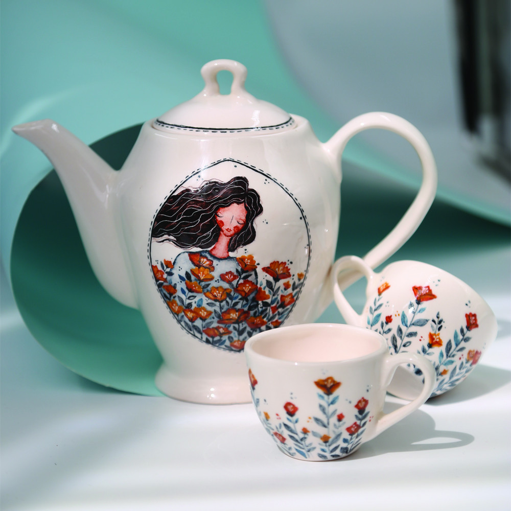 تلفیقی از هنر و کاربرد است. بدنه سفید سرامیک با نقاشی دستی ظریفی از یک دختر در میان گلهای رنگارنگ تزئین شده که حس آرامش و زیبایی را به میز پذیرایی شما میآورد. هر قطعه بهصورت دستساز و منحصربهفرد ساخته شده و ارزش هنری بالایی دارد.