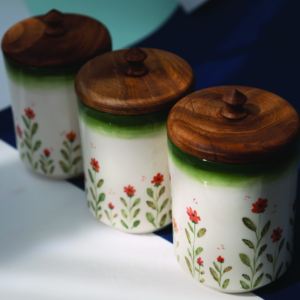 جا ادویهای سرامیکی سفید با نقاشی گل و درب چوبی
