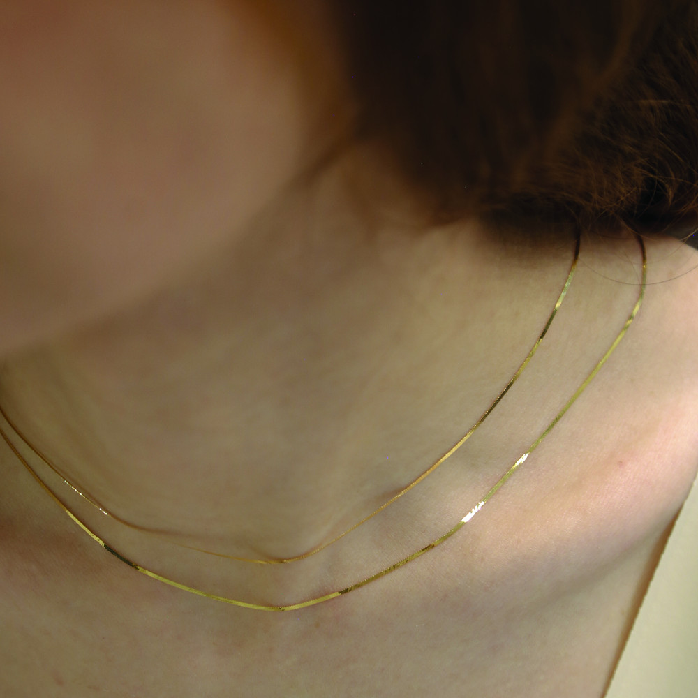 یکی از محبوبترین و خاصترین مدلهای گردنبند زنجیری در دنیای طلا و جواهر است. طراحی این گردنبند بهصورت پهن و تخت میباشد و زنجیرهای آن در کنار هم به شکل الگوی ماهی یا استخوان ماهی (Herringbone) قرار گرفتهاند؛ همین طراحی خاص باعث میشود گردنبند روی گردن به زیبایی بخوابد و جلوهای بسیار شیک و یکدست داشته باشد.