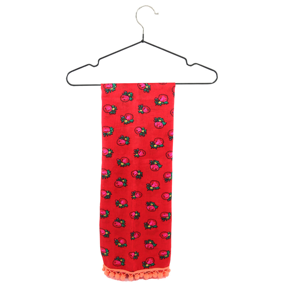 شال گلدار قرمز با گلهای صورتی و یراق منگوله هلویی