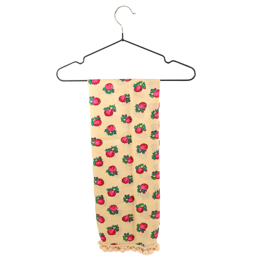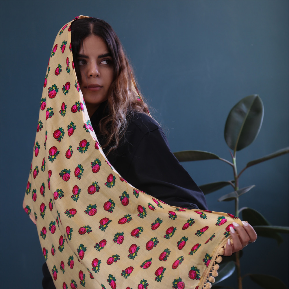 زمینهی کرمرنگ این شال، با گلریزهای صورتی تزئین شده که حس ملایمت و لطافت بهش بخشیده. این ترکیب رنگی هم گرم و صمیمیه و هم بسیار شیک و رسمی، به همین دلیل هم برای استفادهی روزمره مناسبه و هم در مهمونیها میدرخشه.