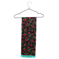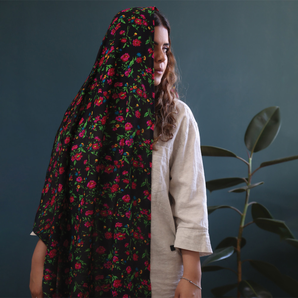 شال را با مانتوی سفید یا مشکی ست کنید تا گلهای قرمز بدرخشند. کیف و اکسسوریهای آبی فیروزهای یا نقرهای جلوهای خاص به استایلتان میدهند.