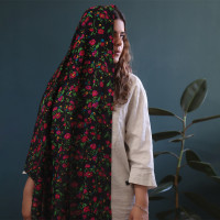 این شال مشکی با گلهای ریز قرمز، درست مثل یک شب عاشقانهست که آسمان تاریکش با نور ستارههایی سرخ روشن شده؛ و آن منگولههای آبی فیروزهای؟ مثل انعکاس آسمان در دریا… آرام، دلنشین و کمی مرموز.