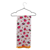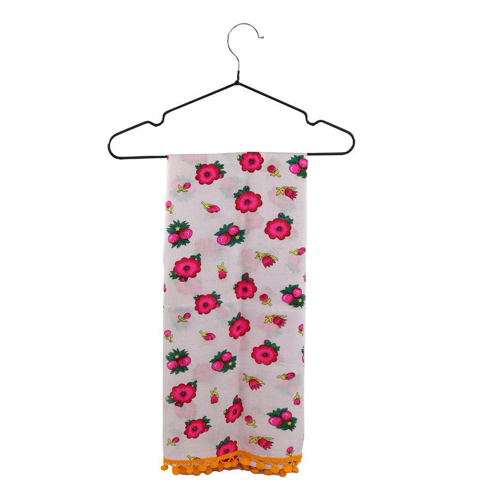 اگر به دنبال یک شال شاد، لطیف و متفاوت هستید، این شال سفید با گلهای صورتی، برگهای سبز و یراق منگولههای نارنجی دقیقاً همان چیزیست که استایل شما را تازه و خاص میکند.